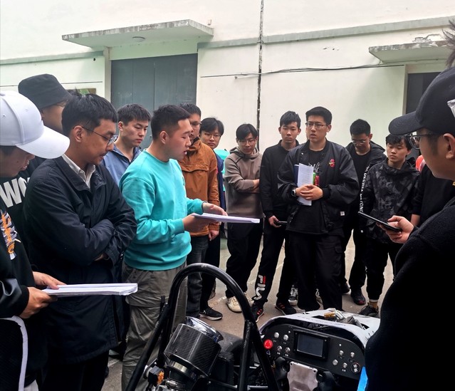 车检流程主要分为静态检测和动态检测两部分。静态检测由轮胎、车身圆角、尾翼鼻翼的长度高度、座舱空间、安全项、制动系统、传动系统等组成。动态检测主要分为噪音检测、DSP制动分析、动态分析。学长们根据赛场往年的实际情况,给队员们提出了优质的方案。在讲解过程中与队员们分享着自己的参赛经验,着重强调了一些容易疏忽的细节。从车手装备到车手逃生,学长们分别进行了详细的讲解。同时,学长们还叮嘱各组负责人面对赛场上突发的问题要勇于担当,敢于面对,以冷静的态度带领组员解决问题。在讲解过程中,队员们积极同学长交流,提出了自己存在的疑问,并由学长一一进行了解答。