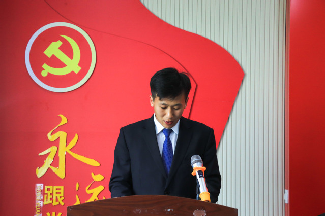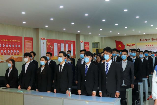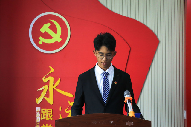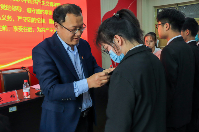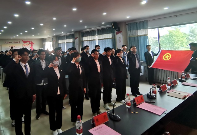 颁奖环节结束后,举行2021年度公司新发展团员入团仪式。与会领导老师为12名新发展团员佩戴团徽、颁发《中国共产主义青年团章程》,团总支书记高萌带领宣誓,新老团员面向团旗,紧握右拳庄严宣誓。能动2001班陶认知代表新团员发言,表示将以入团为新起点,刻苦学习,努力奋斗,发挥先锋模范作用,用实际行动践行入团誓言。
