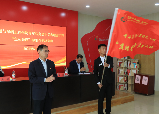 王振为“焦远先锋”培训班授旗并发放学习资料。