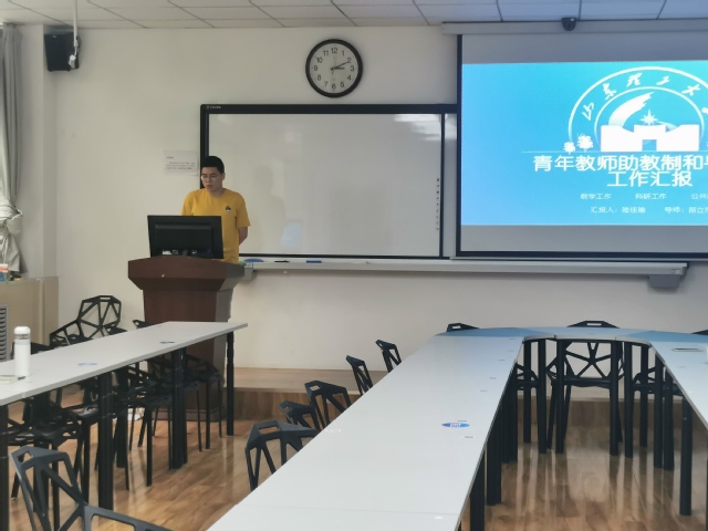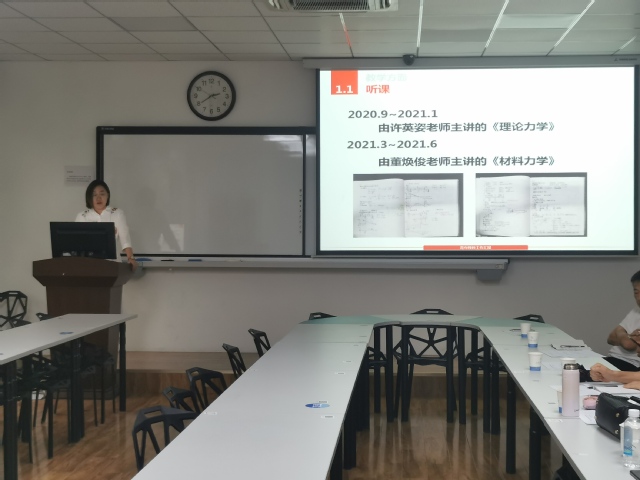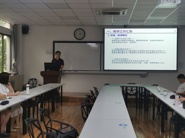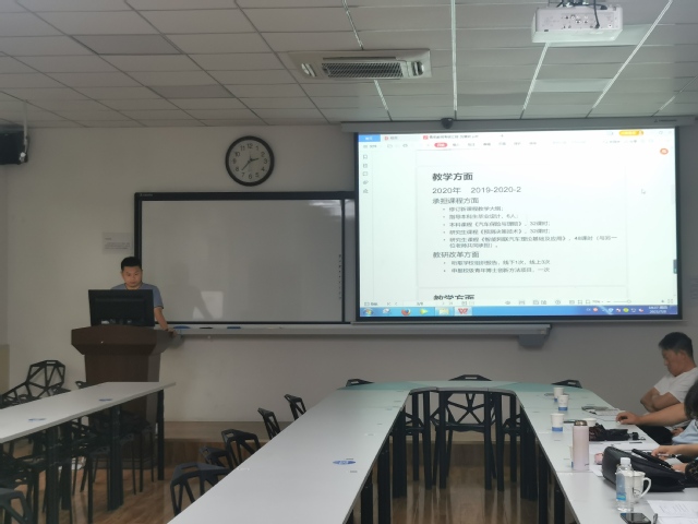 活动开始,刚经理首先介绍了本次活动的考核工作安排和考核流程。青年教师以ppt形式详细梳理了入职以来在各方面的工作开展情况,分别从课堂教学、实践教学、科研成果以及公共服务等几大方面,对一年来的工作进行了精彩汇报。各位指导教师也总结陈述了一年来指导青年教师的过程以及新入职教师听课、助教情况。