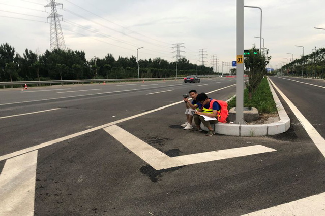 此次实地考察还对封闭道路辅道进出口的车速进行了测量,队员们利用测速枪实时对来往车辆测速,来进行车辆行驶速度调查;通过现场调查发现,来往车辆多为大型货车而且速度较快,但是交通组织状况良好,路段部分封路并未给交通带来显著的影响,通过统计分析处理,为优化交通组织情况提供了有力的数据支撑。