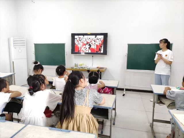 实践团成员张鑫鑫在正式讲课前首先给孩子们播放少先队队歌《我们是共产主义接班人》视频,孩子们兴致浓厚,小声跟随视频哼唱。