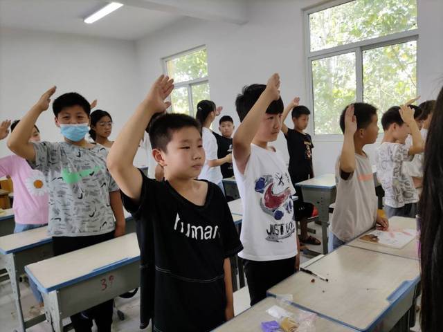 实践团成员以提问的形式将孩子们的注意力吸引到少先队礼节。孩子们各抒己见,讲述自己在少先队中注意的各种礼仪。实践团成员耐心听取孩子们的回答,并统一总结行礼场合、行礼姿势、宣誓姿势、执旗姿势等少先队礼节。最后,实践团成员带领孩子们一起练习行队礼等礼仪姿势,纠正孩子们不规范的姿势。