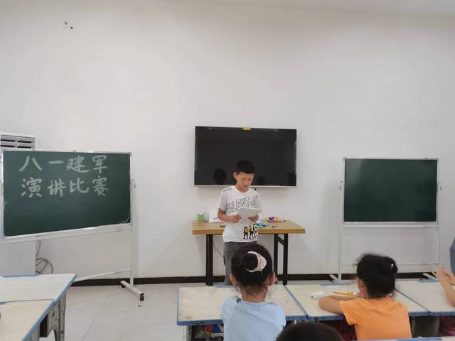 随后,由高年级的孩子们开始,以个人或组队的形式依次上台演讲,同学们前期用心准备,演讲形式多样,以诗词朗诵、演讲稿诵读为主,中间穿插歌曲传唱或舞蹈表演。演讲内容丰富,有的同学提到了建军节的由来,有的同学分享了她对军魂的理解与感悟,还有同学讲述了河南抗洪时军人们义无反顾的英勇事迹。台上的同学全心全意投入演讲,台下的同学也听的专心致志,现场掌声不断,演讲效果呈现良好。