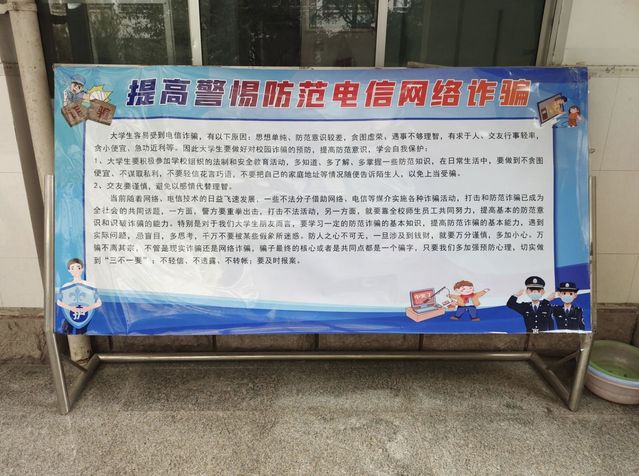 10月21日下午,为提高员工防电信诈骗的意识和能力,警惕校园诈骗,守护美好生活。公司生活服务部同学在9号公寓楼集中开展防电信诈骗活动,制作防电信诈骗宣传展板。
