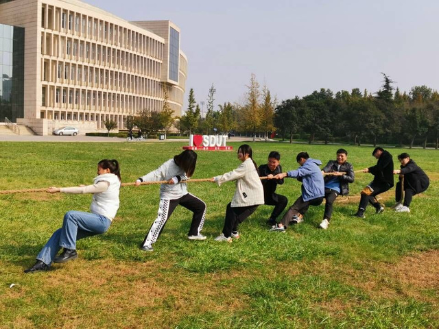 图书馆南草坪,拔河活动紧张而精彩,随着一声哨响,两方各有各的口号,开始卖力拔绳子,场面由低潮到高潮,部分同学在旁呐喊加油,双方都不甘落后,口号喊的也铿锵有力,整个氛围都被带动起来。