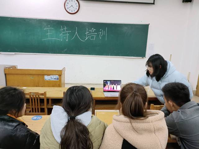 培训由三个环节组成:仪态调整、视频教学、现场示范。黄倩从主持人的仪态、着装、表情进行讲解。她强调在舞台上时仪态端正,站姿挺拔、在主持前需熟读主持稿,上场后一手拿着话筒,另一只手持主持稿放在身体正前方,在其他主持人读稿时应目视前方,面带微笑。