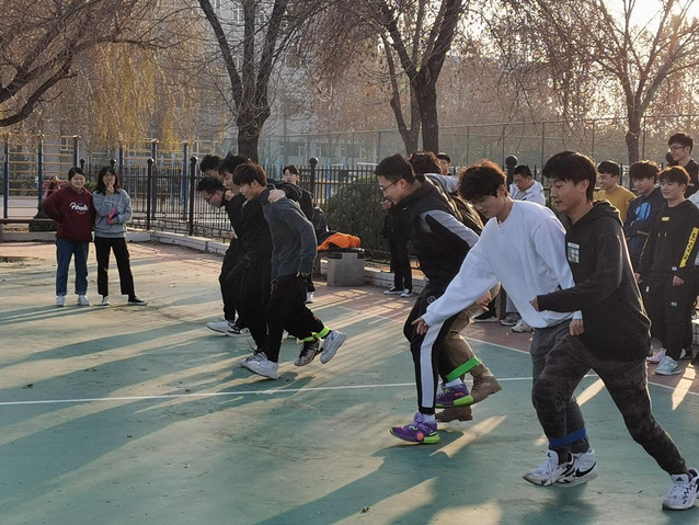 两人三足活动中,大家提前做好了热身运动,随后将腿绑在一起,胳膊搭在彼此的肩膀上,齐喊口号,整齐地冲向终点。趣味投篮中,同学们坐在马扎上,在二分线处投篮,新颖的投篮方式增添了活动的趣味性。随后,体育委员景惠旺设置了飞镖比赛,同学们站在规定的距离线上扔飞镖,每人有三次机会,扔中不同区域会有不同数量的零食作为奖品,同学们纷纷表示活动有趣好玩。