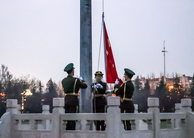 6时30分许,集团国旗护卫队护送着鲜艳的五星红旗,迈着矫健的步伐走上国旗台,在义勇军进行曲雄壮、悠扬的旋律中,现场师生怀着对新一周的憧憬和向往,面向国旗齐唱国歌,注目五星红旗冉冉升起。