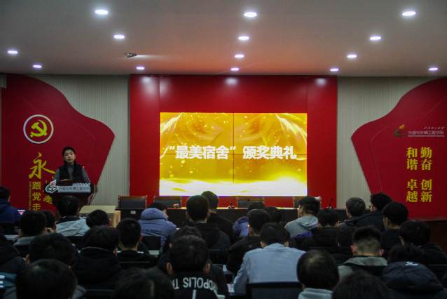 范晶晶老师在颁奖典礼上对受表彰的宿舍表示了祝贺,强调宿舍文化建设、宿舍舍风对学习生活的积极作用和重要性,并希望受表彰的宿舍珍惜荣誉,继续保持佳绩,希望其他宿舍要以受表彰的宿舍为榜样。