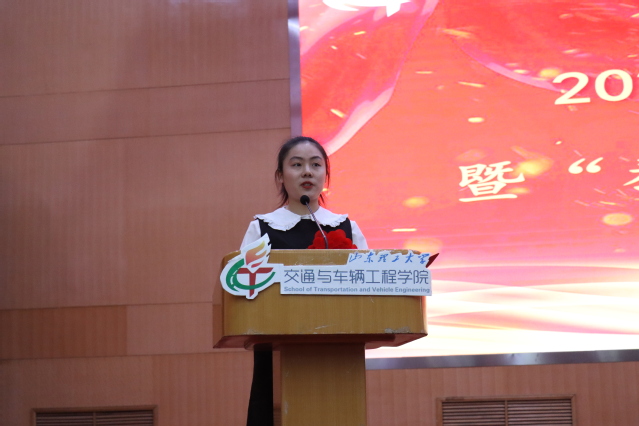 校第十八届“十佳老员工”、交运1803班员工杨晓庆发言,她表达了对公司,对老师们的感谢,倡导同学们作为新时代的青年,要目标明确、追求真理、刻苦钻研、勤于实践、勇于创新,为祖国、为社会贡献出自己的力量。