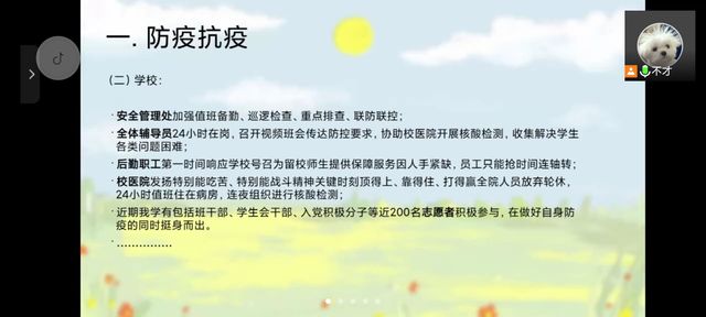 会议主要分为三大部分,第一部分为防疫抗疫。在个人方面,近期同学们都在积极配合做多轮核酸检测,个人的日常疫情防控也不能松懈,心理委员强调应继续遵守疫情防控相关规定,关注官方发布的权威信息,不信谣、不传谣,时刻保持个人防护意识,出门佩戴好一次性医用外科口罩,勤洗手,常通风,少聚集,保持安全社交距离。