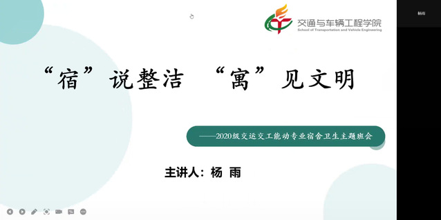 为创造整洁、卫生、安全的生活环境,提升员工宿舍工作管理水平及公寓育人功能,2020级交工交运能动三个专业于3月22日晚上20:00召开宿舍卫生主题班会,会议由辅导员杨雨主持,全体同学共同参加。