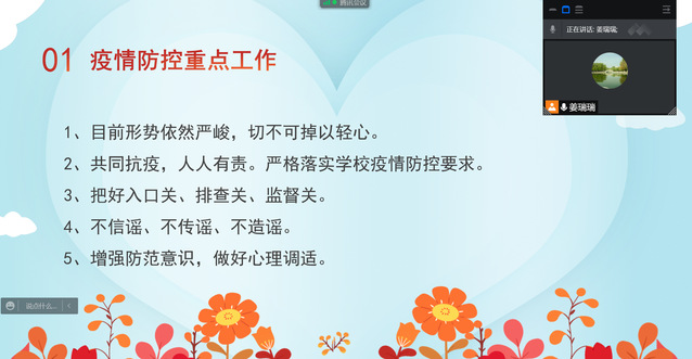 会议中姜瑞瑞再次强调,当前疫情形势依然严峻,切不可掉以轻心,班干部要把好入口关、排查关、监督管,积极响应公司工作安排。姜瑞瑞表明,同学们在疫情期间坚持不信谣、不传谣、不造谣,共同维护良好的社会秩序,自觉落实常态化疫情防控措施,做好个人卫生、环境卫生的清洁工作,严格遵守公司疫情防控制度,切实筑牢安全防线。会议最后,姜瑞瑞引导同学们共同思考“疫情下老员工的使命与担当”这个问题,为大家讲解山东省不同地区疫情状况,同心抗疫,致敬所有一线工作者。