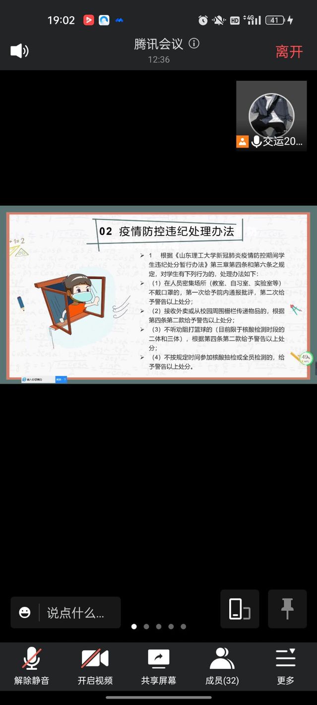 此次会议首先对疫情防控工作进行再次强调,严格落实疫情防控要求,自觉做到不聚集,戴口罩,不瞒报等行为,做到听从组织,服从安排。会议第二项进行学风教育,要求线上上课也要打起精神,调整好状态,不懒散,端正态度,狠抓落实。