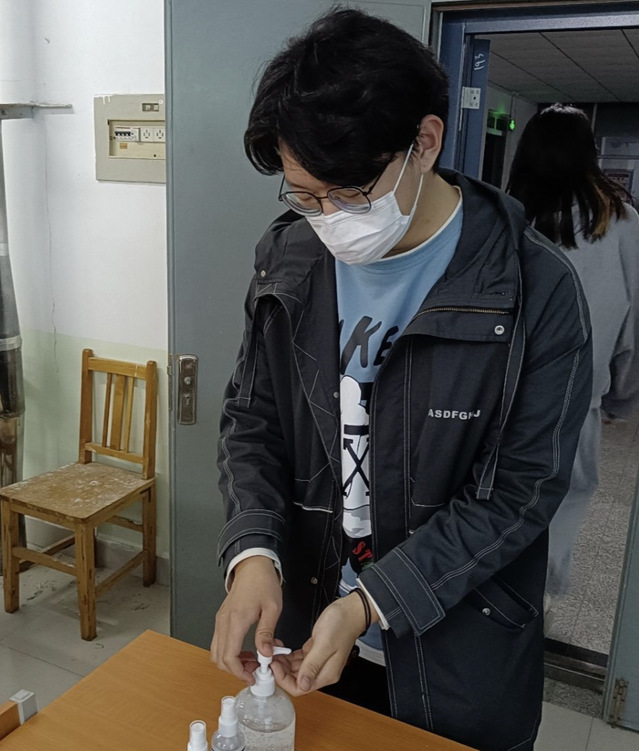 在进入224教室前,所有队员都佩戴好口罩,并在教室门口进行测温和消毒。全体成员隔座就坐,保持距离,严格做好疫情防控工作。