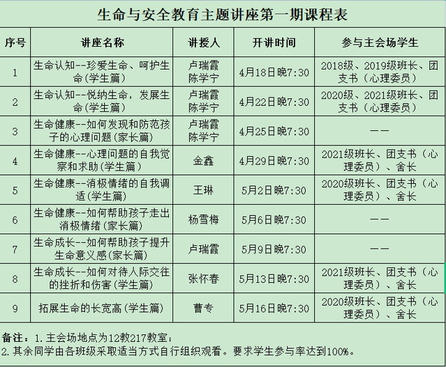 2.其余同学,由各班级采取适当方式,自行组织观看。所有针对员工的课程,要求实现员工参与率100%。请各辅导员于讲座次日在群内上报参与活动人数。