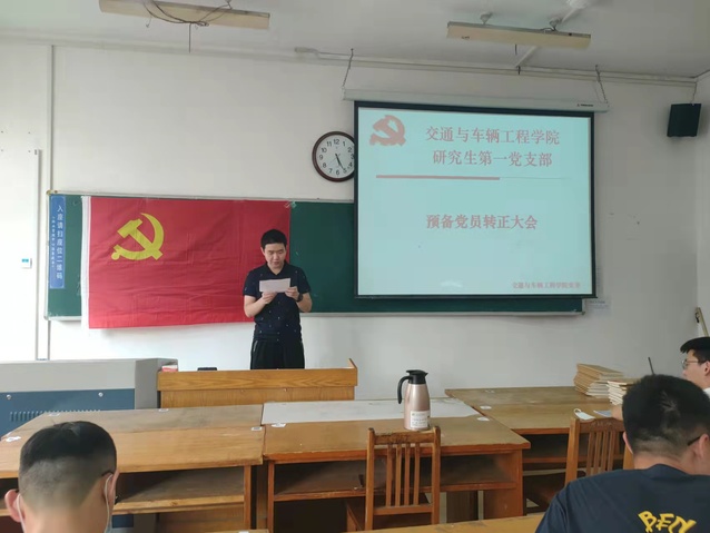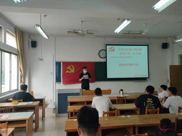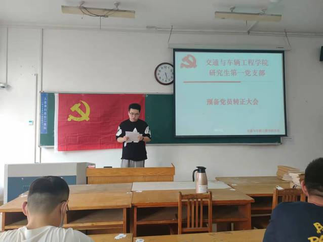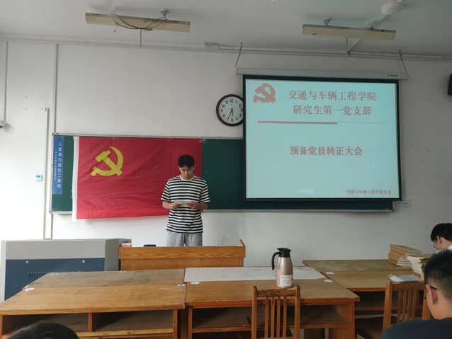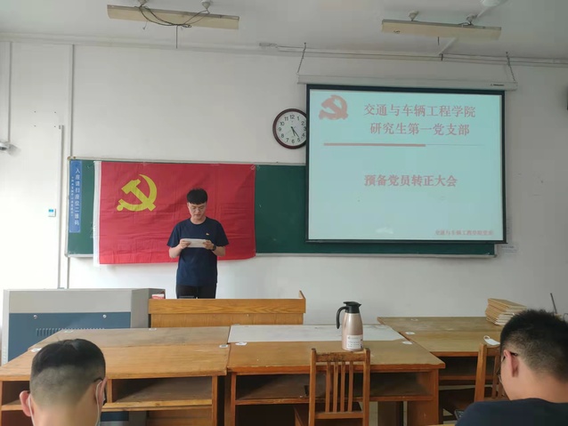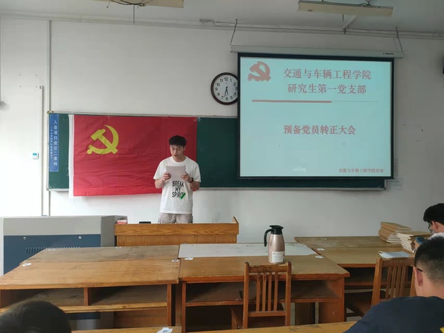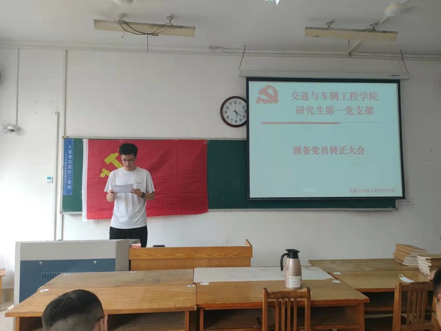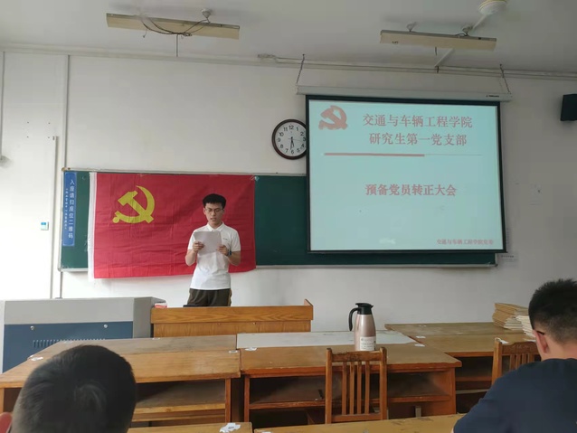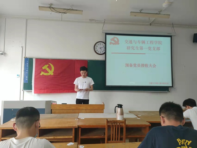 预备党员接收大会上,刘楷文,周鹏程两位党员发展对象依次宣读了入党申请书,介绍了个人基本情况、入党动机、个人思想进步过程和被确定为党员发展对象以后的现实表现;这两位同志的介绍人依次介绍了两位同志考察期间的情况,并发表意见;支部书记张凯代表支部委员会报告了支部对两位同志的审议情况。参会的党员同志对申请人能否转正进行了讨论,与会的正式党员采用无记名方式进行投票表决。