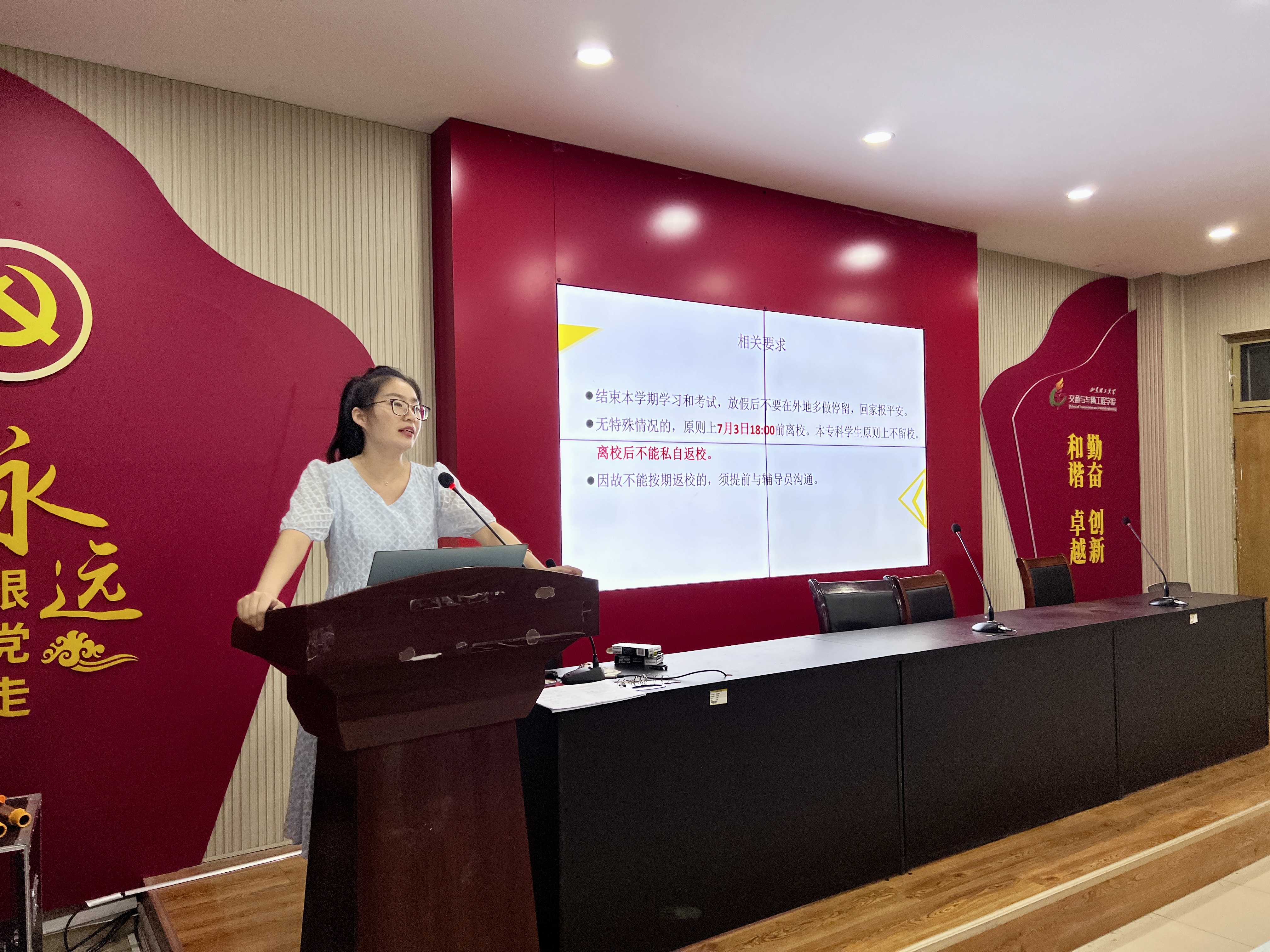 首先,杨雨通报了公司近期考试作弊情况,着重向大家强调了考试纪律,并向大家说明了违反考试纪律所带来的严重后果,告诫员工们要严格执行考试纪律,积极引导员工做诚实守信的模范践行者。其次,杨雨向同学们解读了公司暑期放假相关通知要求,明确了日常各项注意事项及请假外出、离校的流程,要求员工应严格遵守公司各项规章制度、服从公司管理。随后,杨雨就安全教育工作进一步强调。在宿舍安全方面,暑假离校之前应做好寝室卫生,走时关好电源、水源、门窗;在网络安全方面,要求员工增强自我保护意识,提高防范能力,谨防电信诈骗;在交通和财产安全方面,强调遵循交通规则,乘坐正规交通工具,贵重物品随身携带;在防溺水安全方面,通过播放防溺水警示片,普及防溺水安全知识,帮助同学们养成安全行为习惯,提高自我防护能力。