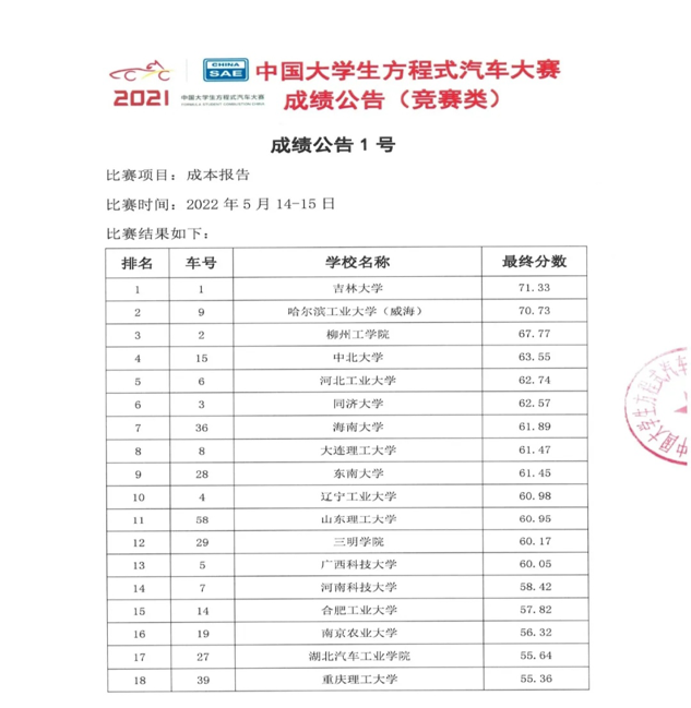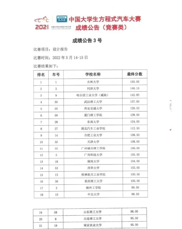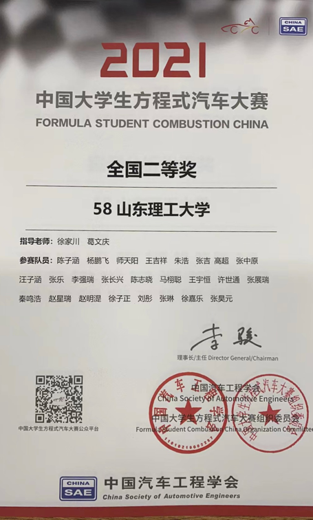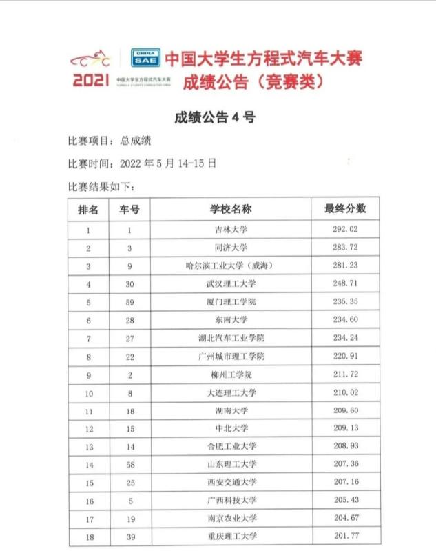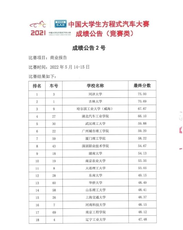 2022年6月19日,中国老员工方程式大赛颁奖典礼通过线上直播进行,体育外网十大平台app至尚方程式赛车队以总分第14名的成绩获得国家级二等奖,同时获评FSCC优秀问答表现奖、案例分析优秀奖,受疫情影响而多次推迟的2021赛季圆满收官!