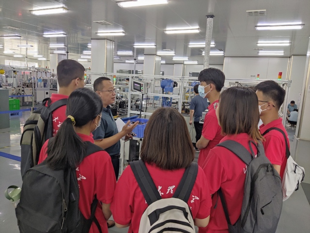 团队成员在魏负责人的带领下,前往汽车电机厂参观汽车电机的制造流程。其主要生产汽车ABS防抱死电机,产品需求量大,智能化程度高。人工只需要把配料摆放到相应工作岛的传送带上,之后的生产工序都由机械臂完成。并且产品进行智能编码,不管哪一天生产、哪一道工序生产都有记录,产品有定位、有信息,方便管理和监测。