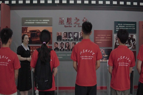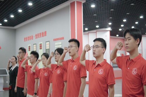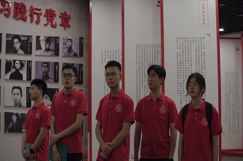 进入党章学堂,首先映入眼帘的便是庄严的入党宣言雕像,实践团成员们在入党宣言前伫立,聆听讲解员介绍党章的意义。随后,讲解员带领实践团学习党章的发展历程。学堂将党章历史概括性的分为火种传播、星星之火、党章的由来、开天辟地、胜利旗帜、执政初探、新的里程、世纪交响、科学发展九大部分,在火种传播章节中,实践团成员通过视频学习党共产党宣言中文全译第一人——陈望道的革命故事,从故事中品味“信仰的味道是甜的”信仰的力量。