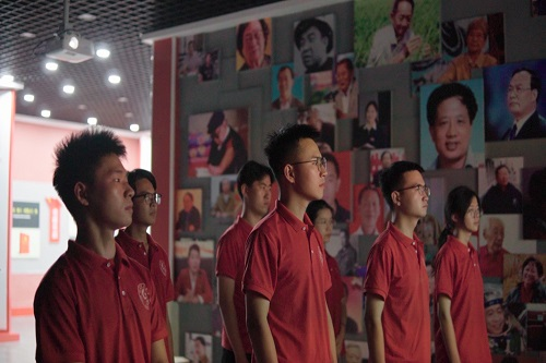 学习完习近平总书记提出的党章学习要求后,实践团拾级而上,仔细学习中国共产党党章总纲中的每一个章程。在“传承红色基因,学习党章人物”的环节中,实践团在红色观影区观看了以廖俊波党员为原型的微电影。电影中廖俊波所展现的共产党党员的信仰和精神,感染了每一位实践团成员,成员在电影尾声的入党宣言声中起立,向这位优秀共产党人致敬。