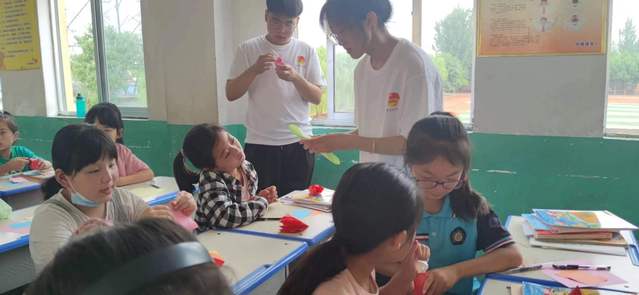 随后,进行的是文体手工课,在了解文体手工课后,他们都露出了欣喜的表情,对接下来的课程充满期待。在队员冀明明的悉心引导之下,同学们认真紧跟冀明明老师的步骤学习折叠红色小草莓。他们在参与手工课的时候,虽然遇到了各种各样的问题挫折,但是都努力克服并在队员们的指导之下逐渐完成并展示了属于自己的手工作品,整个课堂都充满了孩子们的欢声笑语。