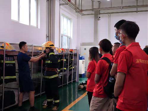 考核过后,张店区消防大队战斗员引领实践团人员参观了消防车,讲解了消防车的组成及各部分功能作用,并向实践团补充了消防过程中所需注意的事项,对实践团工作进行了指导,一定程度上拓宽了实践团成员的眼界并为未来的调研及社区服务传授了经验。并且,在讲解过程中,战斗员特邀实践团成员穿戴消防战斗服,体验消防员出警时的艰辛。