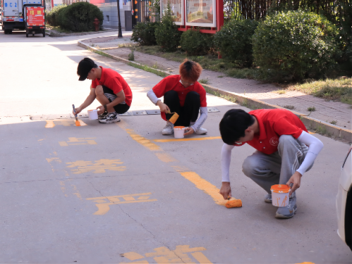 为规范停车行为,规范停车秩序,方便社区管理。实践团对社区磨损严重的交通标识进行补涂补画。活动伊始,实践团在标识两侧贴好定位线以保证补涂的准确性。而后,实践团将涂料倒入托盘内,并用滚筒刷沾取涂料进行整体补涂。最后,用小刷子对标识进行细节处理。晾晒过后,标识线鲜明有序,规范工整。