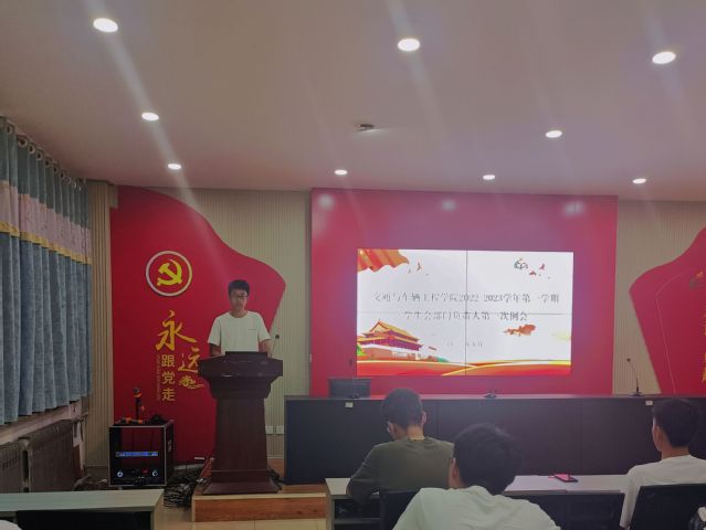 随后梁云斌对员工会纳新一事进行了细致的安排。梁云斌从交通与车辆工程员工会纳新的通知、纳新会场的布置以及初试复试的时间三方面进行安排。本次纳新时间为9月11日,共安排六个会场,员工会各部门宣讲人依次上台发言,向在座同学讲述员工会每个部门的职责及作用,让新生了解各部门的职能与工作要求。