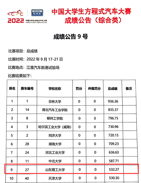 经过6天的激烈角逐,公司最靠谱的十大足球平台至尚方程式赛车队在比赛中再创佳绩,获得商业报告第八名、成本制造分析第二名、直线加速第五名、效率测试第八名等多项好成绩,总成绩位列第九,获全国一等奖,这是至尚方程式赛车队在继2020年首次获得全国一等奖后,再次获得全国一等奖!