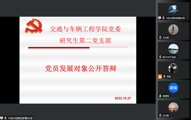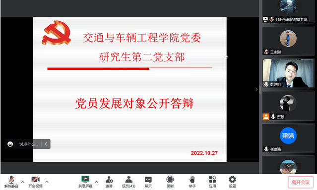 10月27日,研究生第二党支部在腾讯会议进行政治理论学习及党员发展答辩,本次会议由贾硕同志主持,支部全体党员参加。