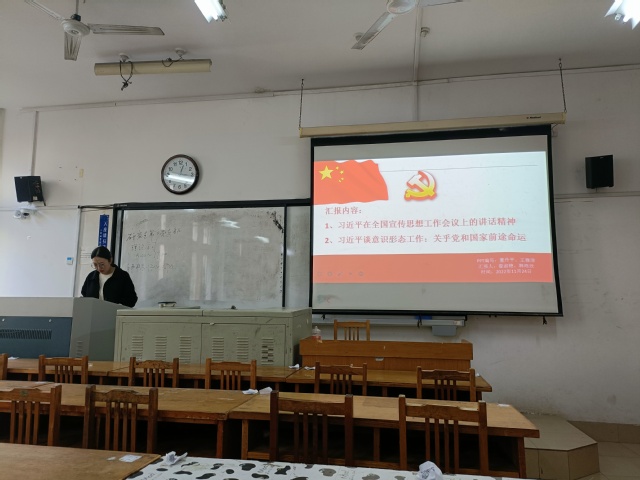 首先学习了习近平总书记在全国宣传思想工作会议上的讲话精神,习近平总书记强调,新形势下宣传思想工作要在坚持正确政治方向的前提下,在基础性、战略性工作上下功夫,在关键处、要害处下功夫,在工作质量和水平上下功夫。随后学习了习近平谈意识形态工作:关乎党和国家前途命运。