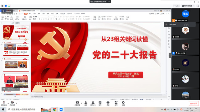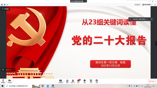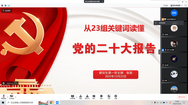 2022年12月22日,研究生第一党支部书记张凯为支部讲授专题党课,党课以线上方式进行。