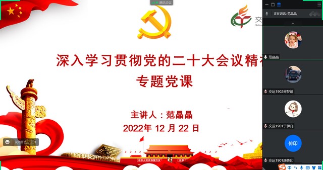 随后,范晶晶同志又带领支部全体党员更加深入的学习了党的二十大报告提出了一系列新思想、新观点、新论断。范晶晶认为,支部全体党员要高举中国特色社会主义伟大旗帜,全面贯彻习近平新时代中国特色社会主义思想,弘扬伟大建党精神,深刻领悟“两个确立”的决定性意义,加深对习近平新时代中国特色社会主义思想、马克思主义中国化时代化、中国式现代化等重大问题的认识,深刻理解党的二十大对全面建设社会主义现代化国家作出的战略部署,切实把思想和行动统一到党中央精神上来。