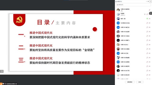 党课主题为《以中国式现代化全面推进中华民族伟大复兴》,高萌从“推进中国式现代化——要深刻把握中国式现代化的科学内涵和本质要求”、“推进中国式现代化——要始终坚持将高质量发展作为实现目标的金钥匙”、“推进中国式现代化——要始终保持新时代踔厉奋发勇毅前行的精神状态”三个方面展开了讲解,他强调中国式现代化体现了基于国情的中国特色,符合社会主义建设和人类社会的发展规律,为人类实现现代化提供了新的选择,中国式现代化是一项伟大而艰巨的事业,是实现中华民族伟大复兴的光明大道,要深刻理解中国式现代化理论和全面建设社会主义现代化国家战略布局的关系,深刻理解其科学性和必然性,坚定不移把党的二十大提出的目标任务落到实处,奋力夺取全面建设社会主义现代化国家新胜利。