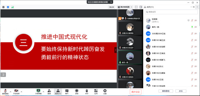 支部全体党员对内容进行了认真的学习和思考,王海峰同志作为代表发表了学习感悟,他充分认识到了中国式现代化是党领导人民走出的一条符合中国实际的道路,是有鲜明的中国特色的,在推进过程中,还有不少困难和挑战,需要始终坚持中国共产党的领导,敢打敢拼,勇毅前行,在党的领导下促进高质量发展,实现中华民族伟大复兴。