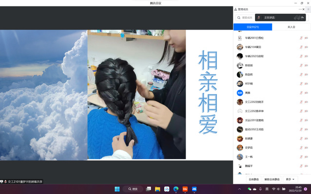 为推进校园精神文明建设,营造温馨友好的宿舍氛围。12月29日晚,在线上举办了“相‘寓’你们,一见终‘寝’”宿舍短视频大赛决赛。决赛评委由生活服务部负责人及核心成员担任,部门其他成员维持会议秩序,保证会议的顺利进行。