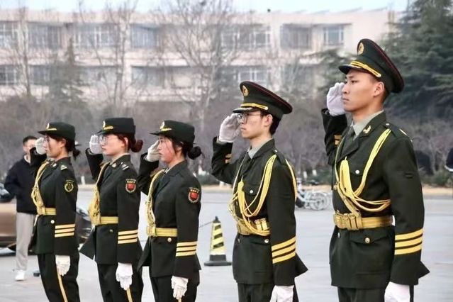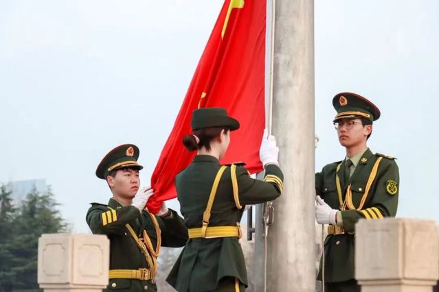 迎着东方升起的第一缕晨曦,英姿飒爽的国旗班成员目光坚毅,迈着铿锵有力的步伐走向旗台,动作整齐划一,气氛庄严肃穆。在庄严的国歌声中,鲜红的五星红旗迎着风升起,全体人员肃然而立,面向国旗行注目礼。
