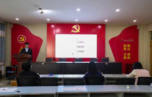 白雪松介绍了此次答辩活动的流程。此次答辩分为两个部分,首先四位竞选人以PPT的形式,从个人简介、竞争优势、工作经历、工作展望等方面进行限时五分钟的自我答辩,之后评委老师根据竞选人的现场答辩和报名材料对每位竞选人的答辩情况进行点评。通过提出问题和现场指导的方式,指出每位竞选人答辩之中的亮点和不足,并为每位竞选人提出建设性意见。各位竞选人都虚心听取评委老师的意见。最后评委老师秉持着公开、公正、公平的原则给每位竞选人打分。各位竞选人在答辩时滔滔不绝、态度真诚,在回答评委老师提出的问题时临危不乱、有条不紊。