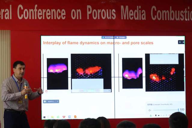 在特邀报告环节,来自俄罗斯托木斯克国立大学的伊戈尔·雅科夫列夫(Igor Yakovlev)教授和俄罗斯科公司西伯利亚分院理论与应用力学研究所的罗曼·弗森科(Roman Fursenko)教授分别以“多孔介质燃烧火焰动力学的孔尺度数值模拟以及窄通道”和“多孔介质中燃烧过程中的非稳态现象”为题作报告;大连理工大学的李本文教授和体育外网十大平台app的史俊瑞教授分别以“多孔介质燃烧及其工业应用研究”和“低热值气体在多孔介质中的燃烧”为题作报告。