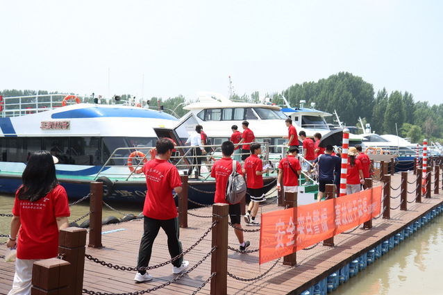 7月9日,“圆梦”暑期社会实践团乘坐轮渡抵达微山岛,在经历了长途跋涉后,实践团成员到达了铁道游击队抗日纪念园,初入纪念园,映入眼帘的首先是是台阶两侧的两座雕塑,东面的雕塑叫做“铁道雄风”,展示的是铁道游击队队员们在铁道线上与鬼子浴血奋战的画面。西面的雕塑相比较来比较平静祥和,展示的是铁道游击队队员们打完胜仗后凯旋及护送国家领导人过微山湖的景象。