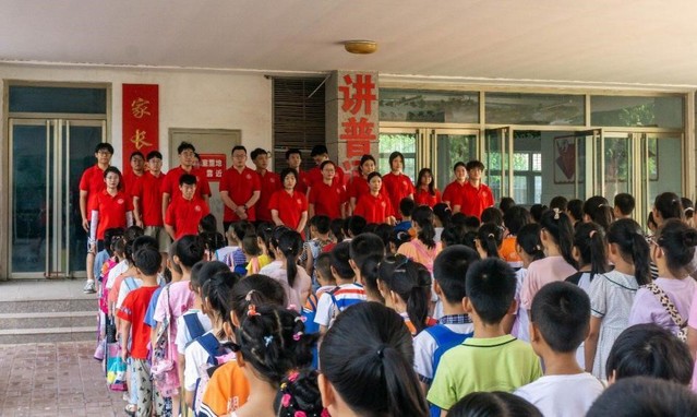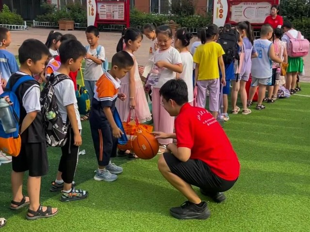 早上,实践团成员与王建秀早早等候着孩子们的到来,团队成员与五个年级的员工在明德小学门口迎来了初见。团队成员身穿统一队服向员工问好并拿起员工沉重的书包带领他们在操场集合,入校的员工洋溢微笑,充满了期待,到达集合点后;操场上的班主任引导员工排队,酷爱运动的员工手里拿着篮球与实践团成员进行互动。
