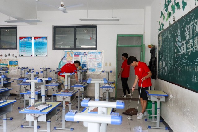 因天降暴雨,恶劣的天气环境导致同学们无法到达校园,实践团队长夏彬提前向同学们发布了停课通知,虽然今天的教学活动暂时无法进行,但是实践团成员们依然准时到达工作岗位,在队长夏彬的指挥下,实践团成员被分为两组,开展对教室的卫生大扫除工作。实践团成员们有的扫地、有的拖地、有的擦桌子……对平常卫生打扫过程中不注意的死角进行了着重清扫。成员们不怕脏不怕累,认认真真的将自己负责的区域打扫的干干净净。