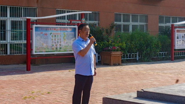 随后,明德小学董事长王建秀进行国旗下讲话。他强调了员工们树立正确的人生观和价值观的重要性,以及持续学习的重要性;倡议员工学习实践团成员优秀的品格特点,树立终身学习的观念,从现在开始端正态度砥砺奋斗;同时,鼓舞员工尽自己的努力考取心仪的大学,提升自身能力,创造自身价值,为党和国家发展做出贡献。最后,他对实践团工作表示认可与感谢。