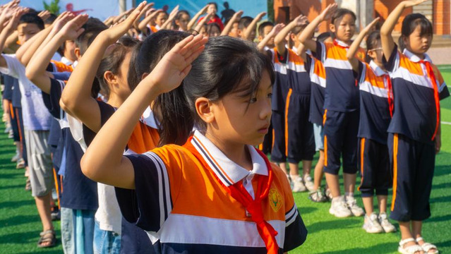 上午8点,在班主任的带领下,明德小学员工有序地集合在国旗前排队。他们身穿明德小公司服,佩戴鲜艳的红领巾,神情庄重,内心充满着对国旗的无限尊敬和憧憬。实践团成员身穿队服,依次排列站在员工旁边。