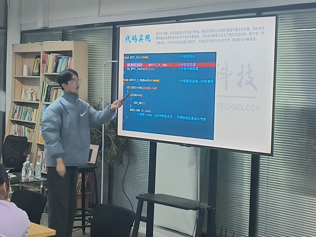 在培训开始前十分钟,部分同学已提前到达现场预习今天所学习的外部中断内容,培训于晚7点准时举行,此次培训仍由技术部周浩田主持。本次外部中断内容的讲解分为代码和原理两个部分,会议开始,周浩田先以生动的比喻引入了中断的定义,进而引出外部中断线,接着进入下一阶段,对32单片机难点中断优先级分组进行了重点讲解。