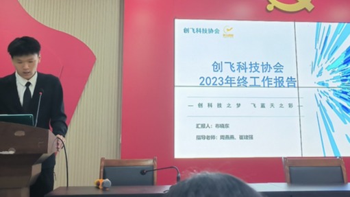 创飞科技协会答辩人布晓东以“创科技之梦 飞蓝天之彩”为主题,展示了社团在这一年中的各项活动和获得的成就,以及媒体宣传。他认为创飞科技协会发展的越来越好,为公司以及社会培育人才。