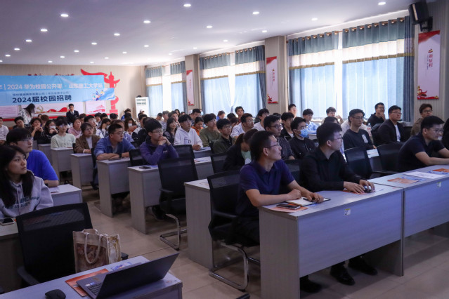 华为淄博地市负责人陈粤介绍了华为公司的业务内容,华为工作人员轮流向同学们介绍了华为问界汽车的智能化、华为鸿蒙操作系统以及公司的培养模式、招聘要求和招聘岗位。